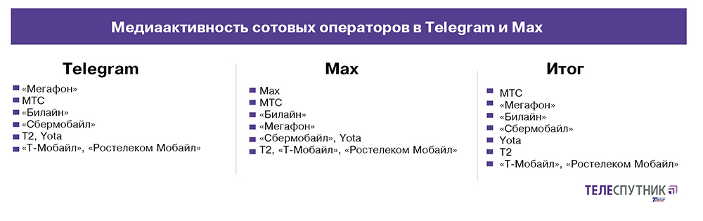 Итоговый топ медиаактивности российских сотовых операторов в мессенджерах Telegram и Max выглядит следующим образом: первое место — МТС, второе — «Мегафон», третье — «Билайн». Затем — «Сбермобайл», Yota и T2. В аутсайдерах — «Т-Мобайл» и «Ростелеком мобайл».