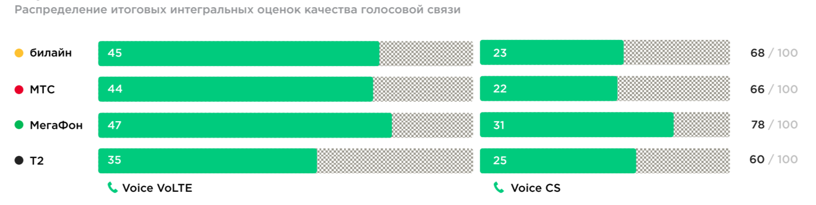 Из результатов исследования следует, что «МегаФон» занимает первую позицию в рейтинге итоговых оценок качества голосовой связи. Компания демонстрирует наибольшую оценку как для соединений на основе коммутации каналов (CS), так и для соединений на основе технологии VoLTE. По качеству голосовой связи опертор занимает первую позицию в 34 городах из 82. В Приволжском, Северо-Западном, Сибирском, Уральском и Южном округах он опережает конкурентов по количеству городов, в которых лидирует по качеству голосовой связи. В Дальневосточном округе — в четырех городах