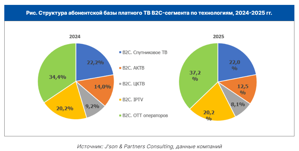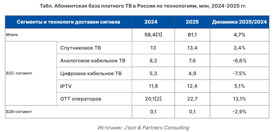 По оценкам аналитиков J'son & Partners, абонентская база платного ТВ в технологиях доставки сигнала по кабелю (аналоговый и цифровой) в 2025 году продолжила снижение. Но потеря абонентов в них была полностью компенсирована за счет спутникового ТВ, IPTV и ОТТ. В результате общая абонентская платного ТВ база выросла. В конце 2025 года услугами платного ТВ в России пользовалось 61,1 млн абонентов, что на 4,7% выше, чем в 2024 году. По уточненным данным, в 2024 году рост составил 6,6%.